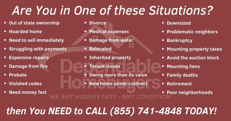 There are numerous situations in which our home buying company can prove useful. Whether you are facing foreclosure, divorce, upcoming relocation plans, or even inheriting a property you just don’t need, we can be there to make an offer. Do you own a vacant home? Are you dealing with a glut of repairs you can’t afford? Fire damage? Are you overwhelmed by mortgage payments? All of these possibilities can lead you to Dependable Homebuyers’ services. Dependable Homebuyers can remove the burden of your property, and we can leave you with CASH in your pocket! It really can be that simple! You may have heard of home buying companies before. Dependable Homebuyers is different from any other that you might come across. Within twenty-four hours of submitting your information to Dependable Homebuyers, we can return to you with a strong CASH offer. We will close only when you are ready to close. Furthermore, don’t let the need for repairs stop you from contacting us. If you don’t want to deal with those repairs, then don’t worry about it! Dependable Homebuyers can handle everything for you.